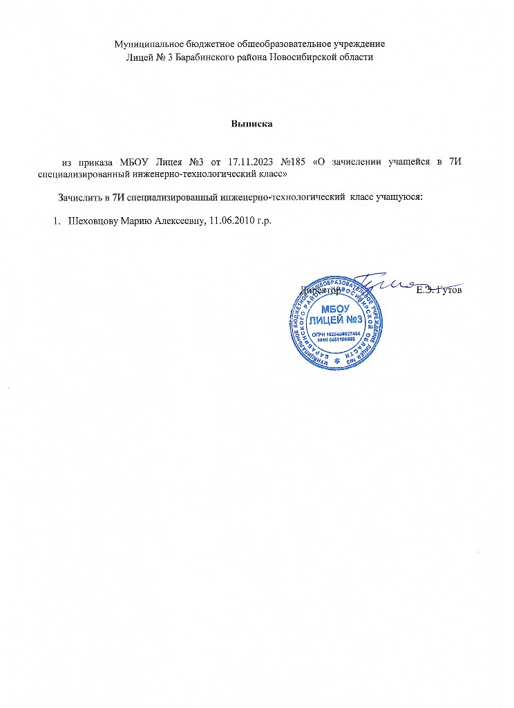 Приказ "О зачислении учащихся в 7 "И" класс специализированный инженерно-технологический класс"