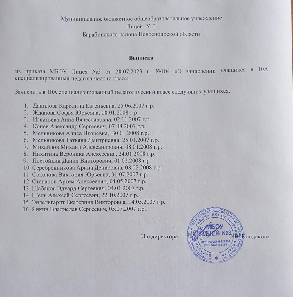 ПОЛОЖЕНИЕ о специализированном классе МБОУ Лицея № 3 Барабинского района Новосибирской области